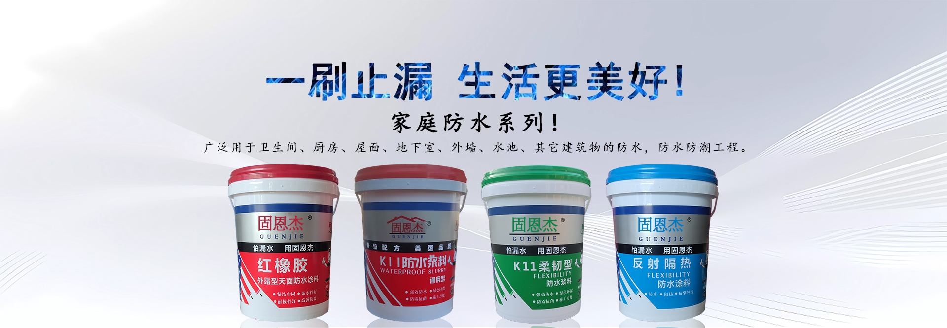 廣州固恩杰防水建材科技有限公司(簡稱:固恩杰)是集研發(fā)、生產、銷售于一體的高新技術建筑材料制造企業,與多個國際知名化工企業建立良好穩(wěn)定的戰(zhàn)略合作伙伴關系,公司目標是打造中國最具競爭力的防水品牌 。公司產品具有質量穩(wěn)定可靠、耐久性好、綠色環(huán)保、對人體健康無毒害作用、使用方便、粘結力強、耐候性好、提高工程質量、降低工程造價等優(yōu)勢,是提升人們居住環(huán)境質量的換代產品,廣泛應用于新舊商住樓,賓館會所、辦公樓寓的室內外裝修工程。